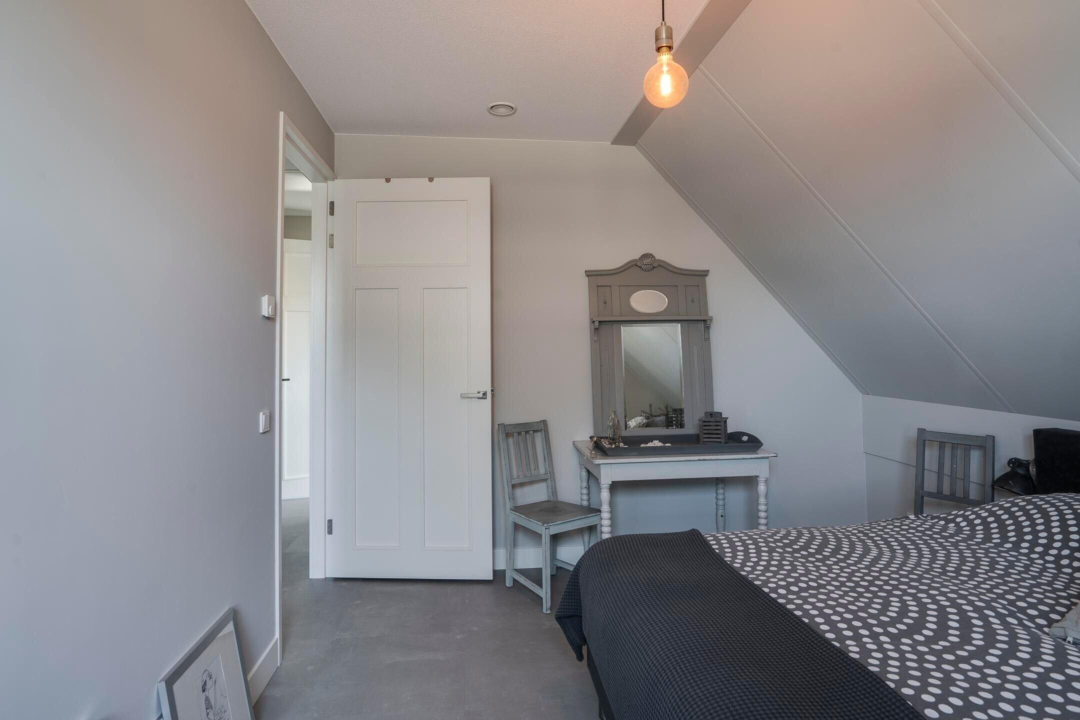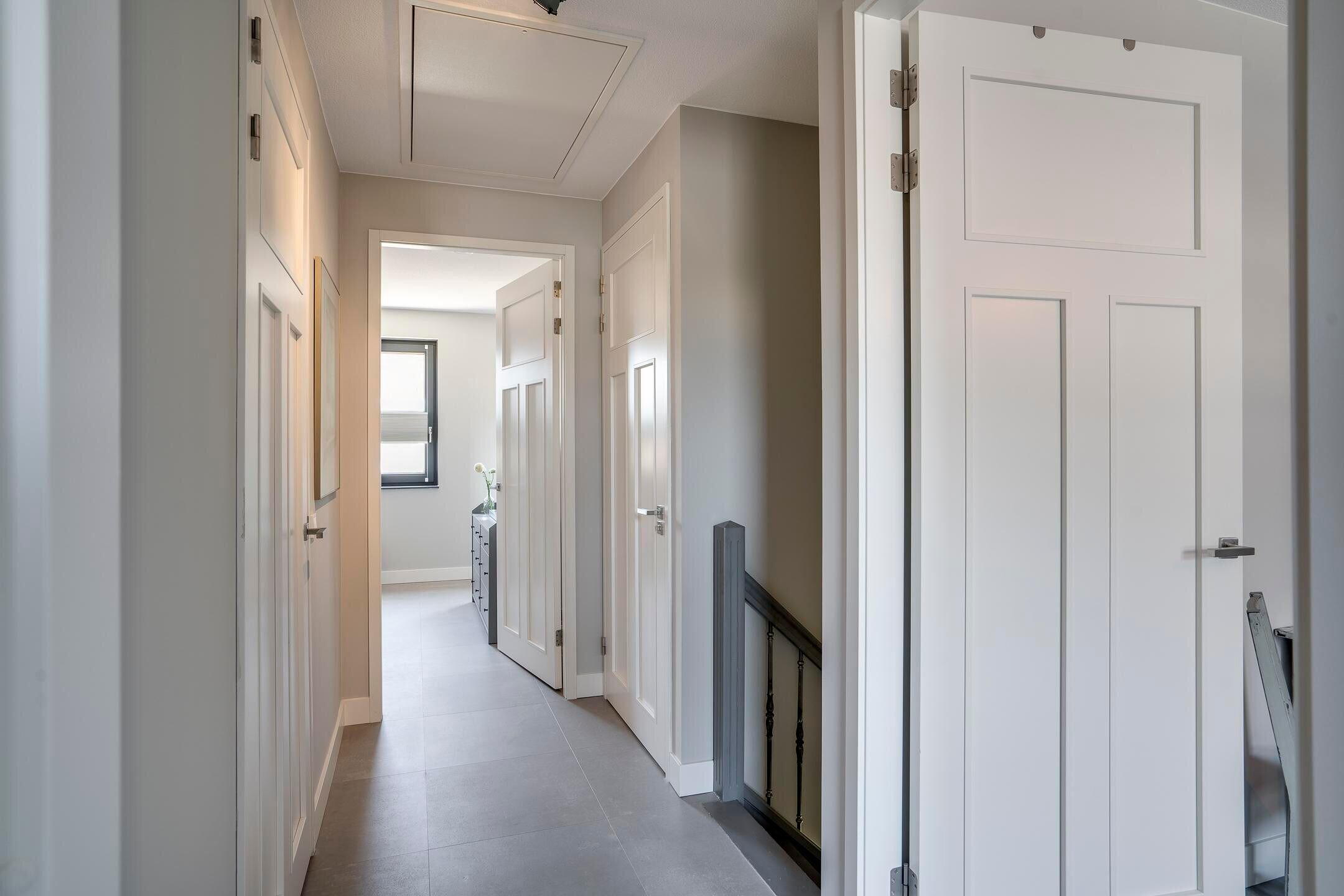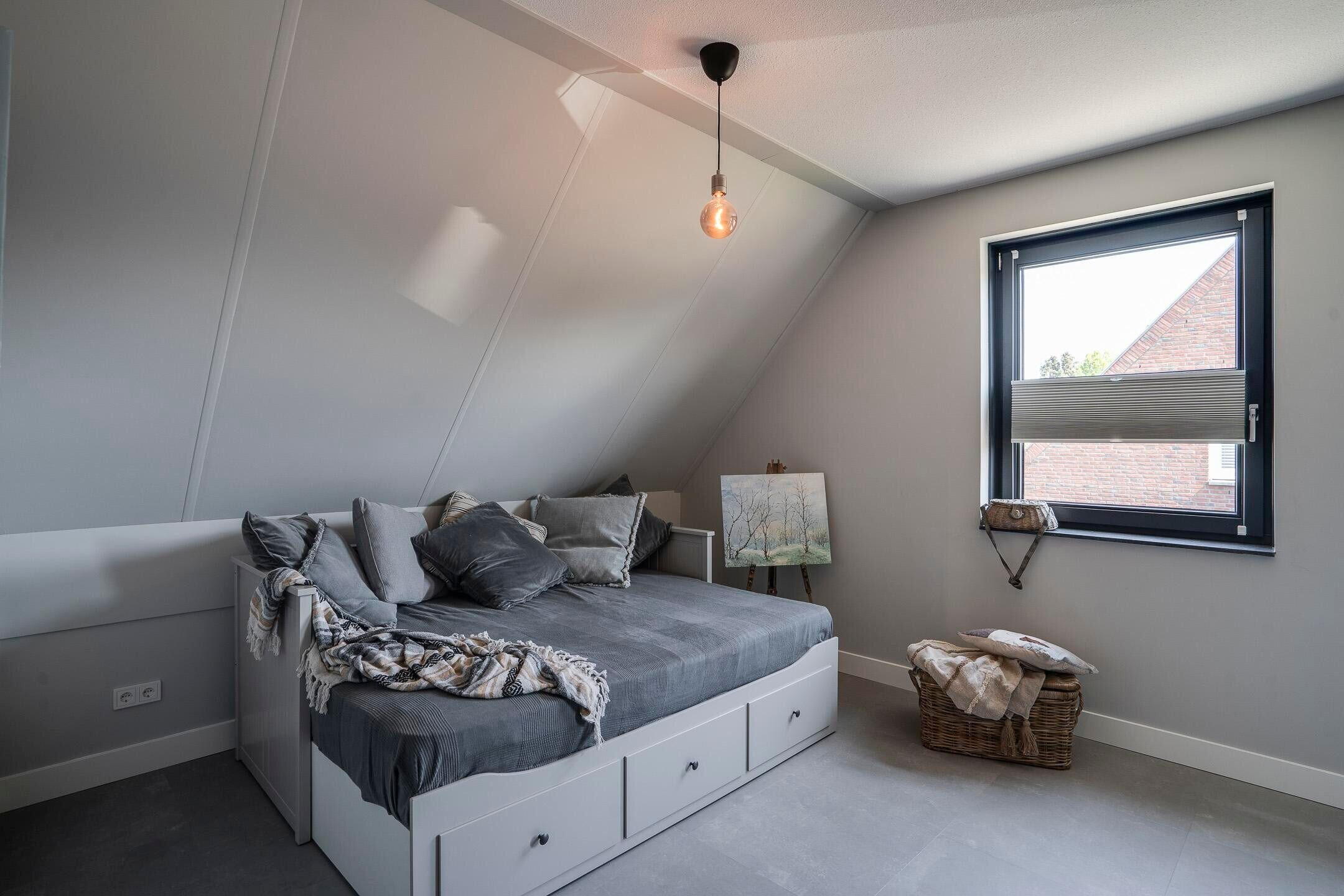 Op de eerste verdieping bevinden zich drie volwaardige slaapkamers en een tweede ruime badkamer, ingericht met een inloopdouche, dubbele wastafel en toilet. Op deze verdieping bevindt zich ook de technische ruimte met opstelling van het witgoed. Daarnaast is er een ruime zolder aanwezig, bereikbaar via een vlizotrap, geschikt voor opslag.