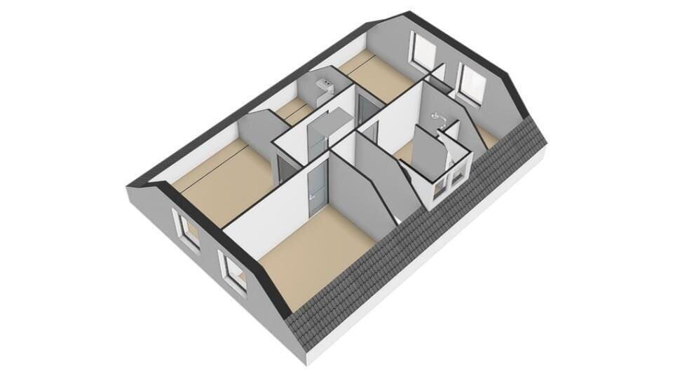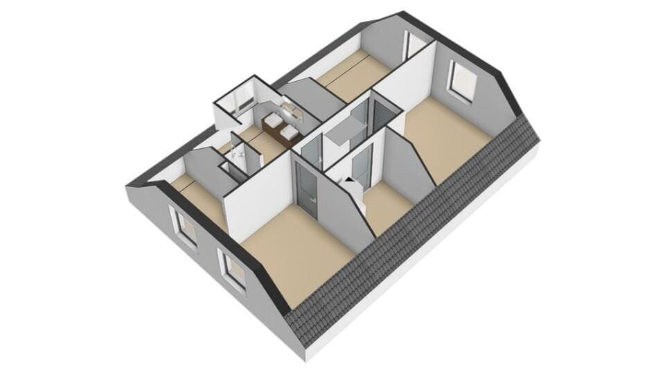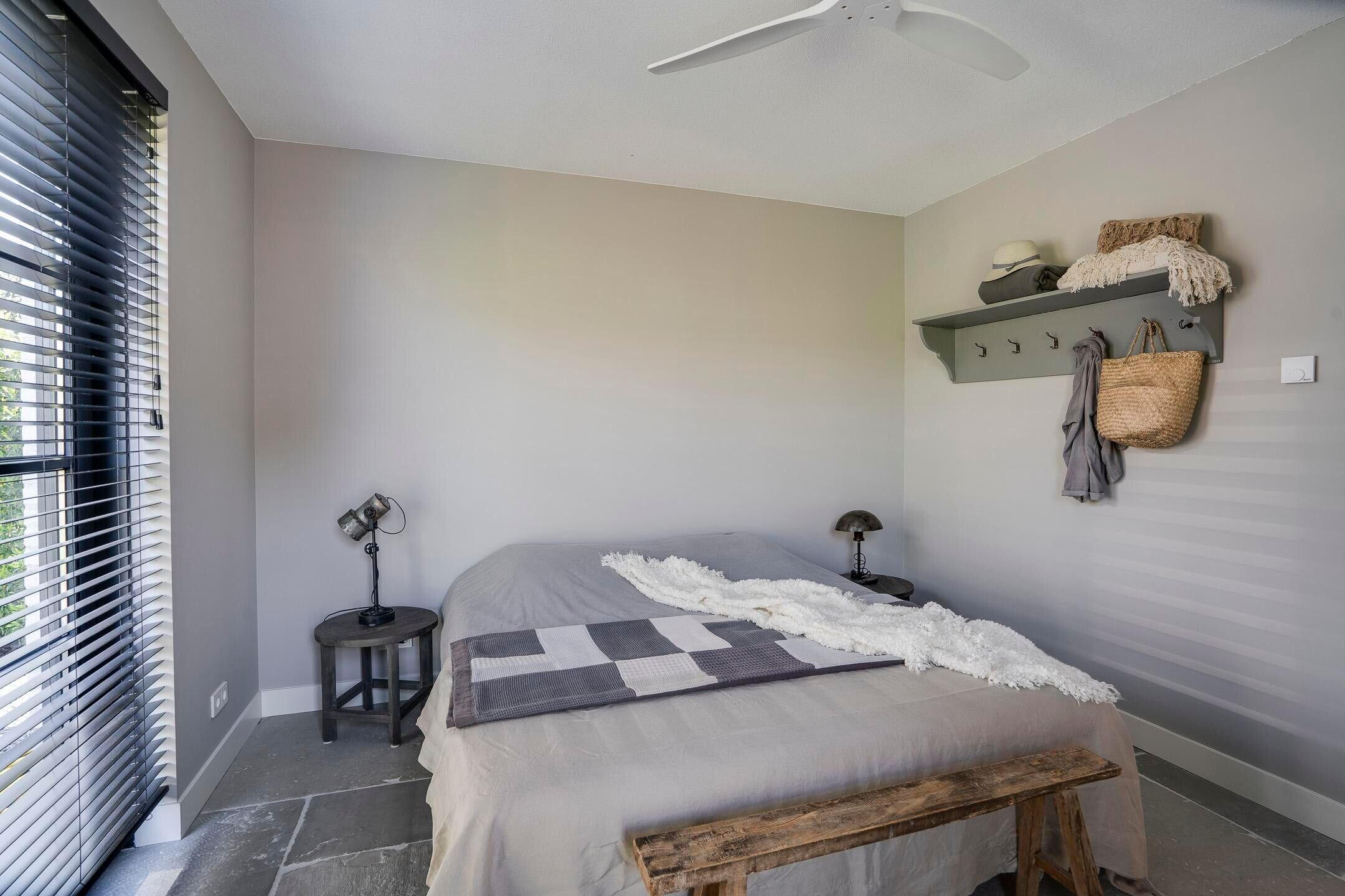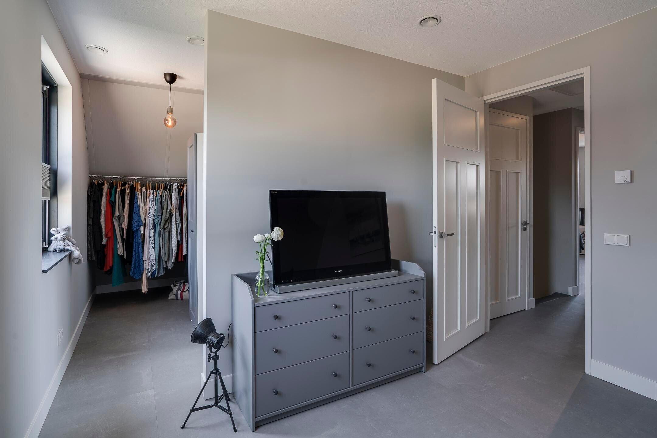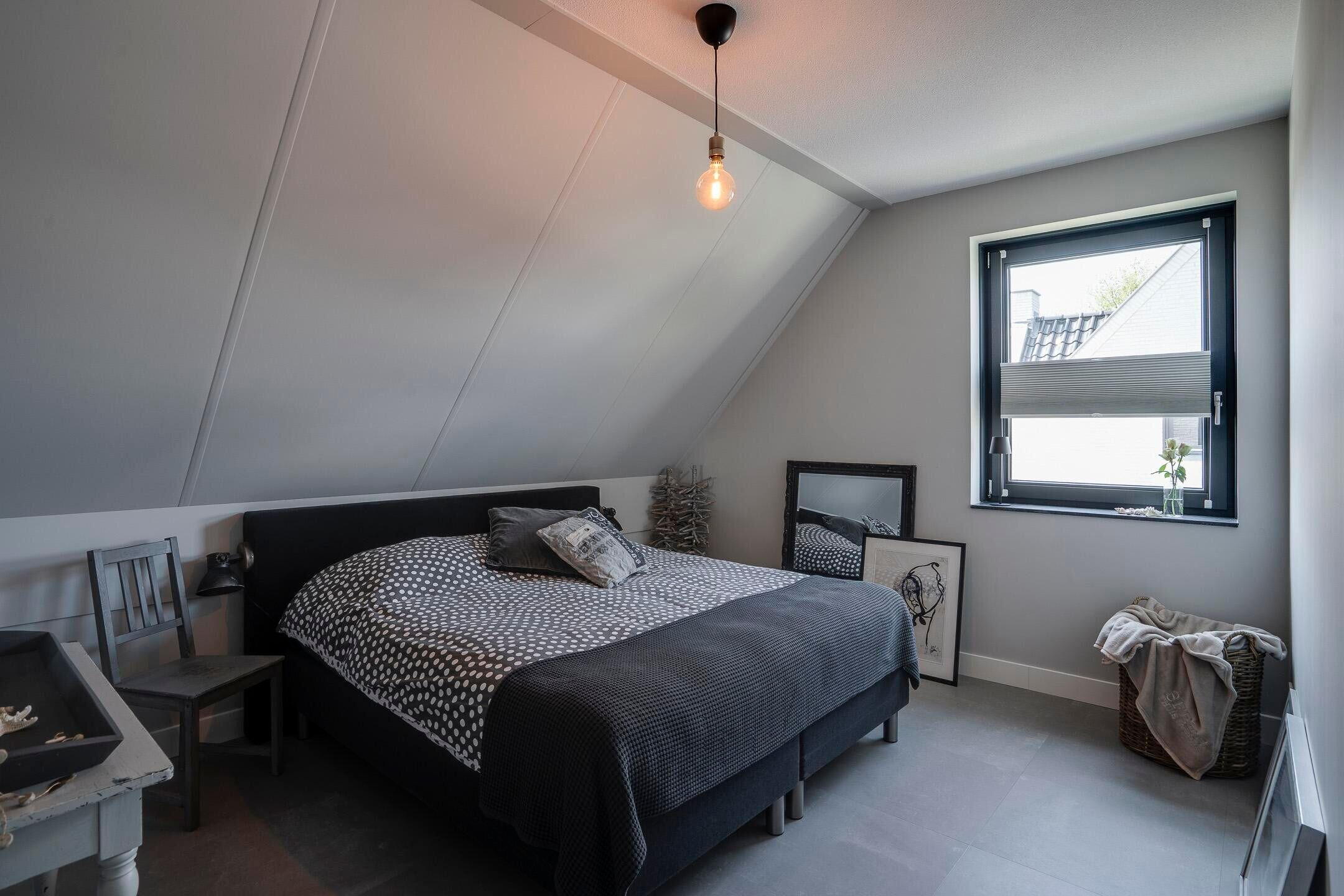 Op de eerste verdieping bevinden zich drie volwaardige slaapkamers en een tweede ruime badkamer, ingericht met een inloopdouche, dubbele wastafel en toilet. Op deze verdieping bevindt zich ook de technische ruimte met opstelling van het witgoed. Daarnaast is er een ruime zolder aanwezig, bereikbaar via een vlizotrap, geschikt voor opslag.