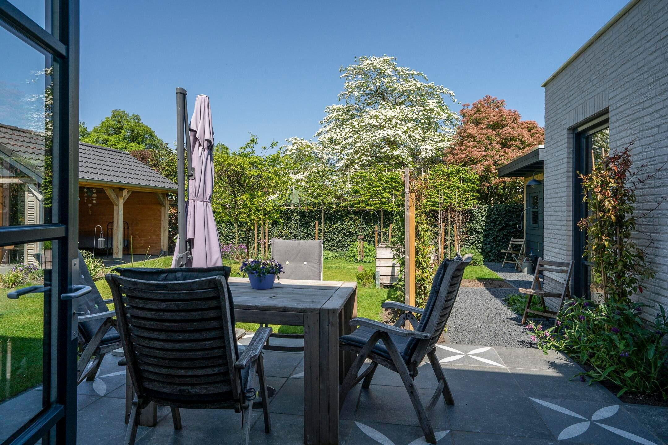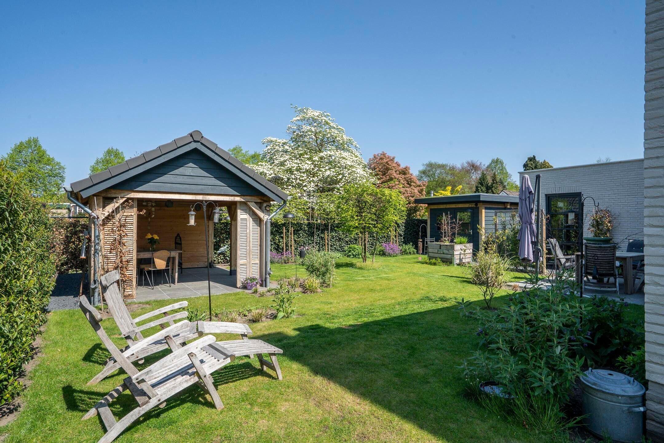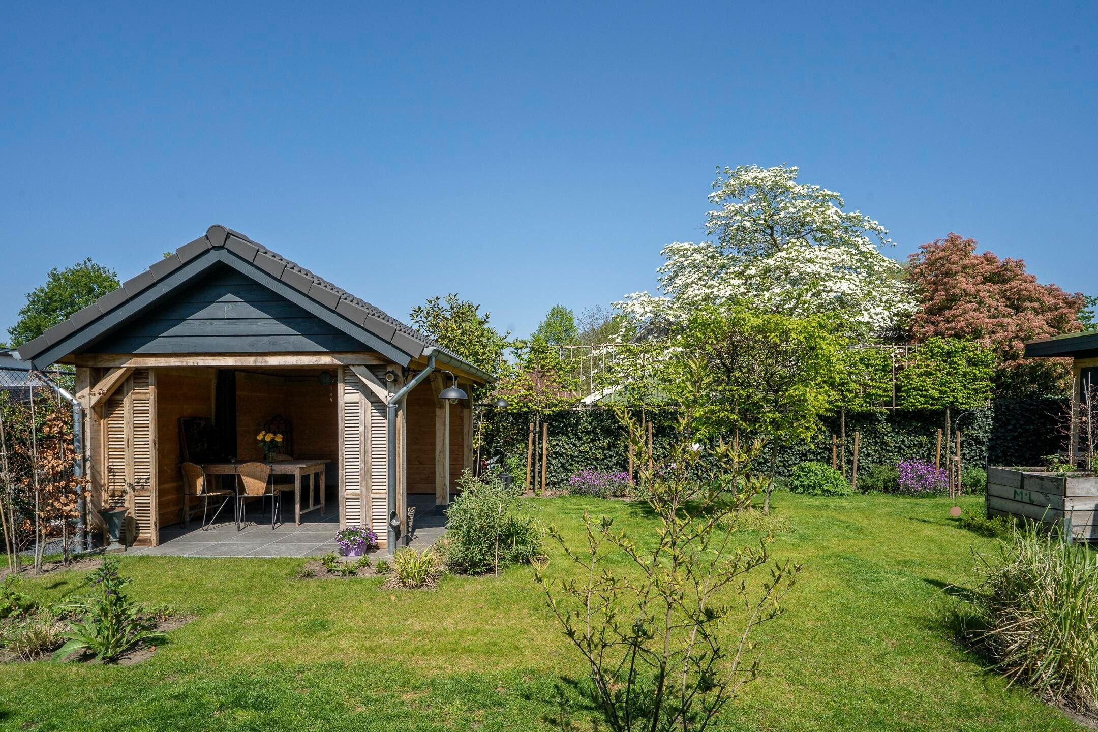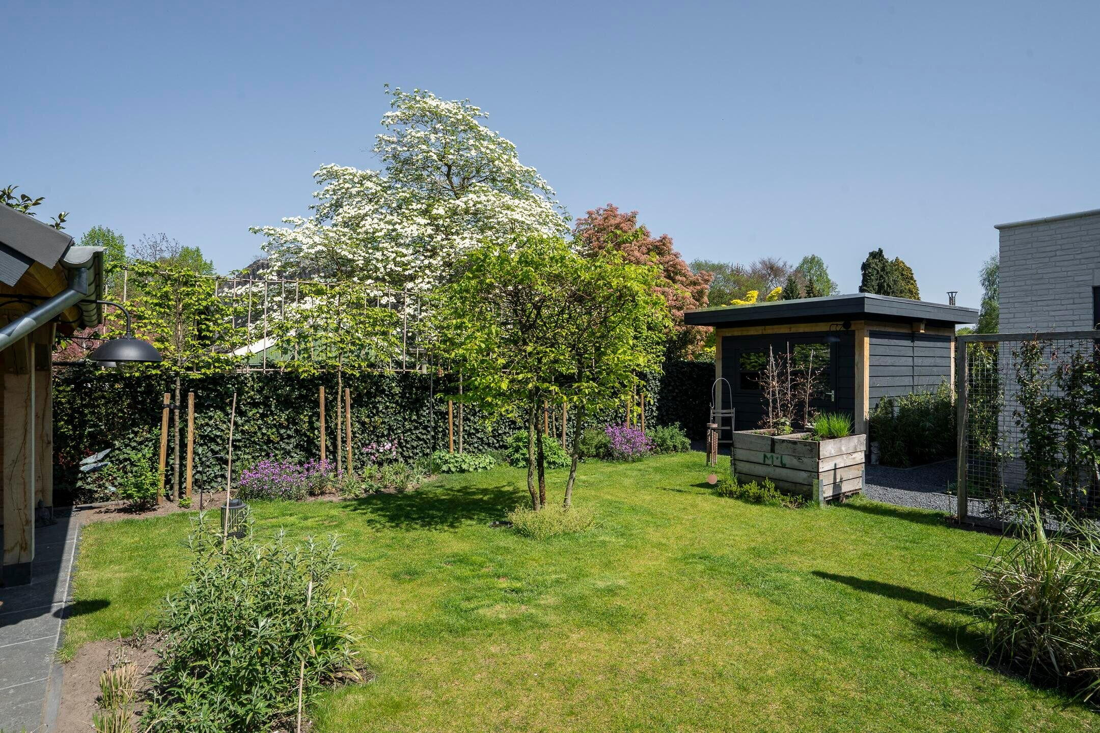 De onder architectuur aangelegde tuin rondom de woning biedt veel privacy. Hier vindt u onder meer een terrasoverkapping, een volledig geïsoleerd tuinhuis en een grondwaterput ten behoeve van de beregening van de tuin. Bij de oprit zijn voorbereidingen getroffen voor het plaatsen van een laadpaal.